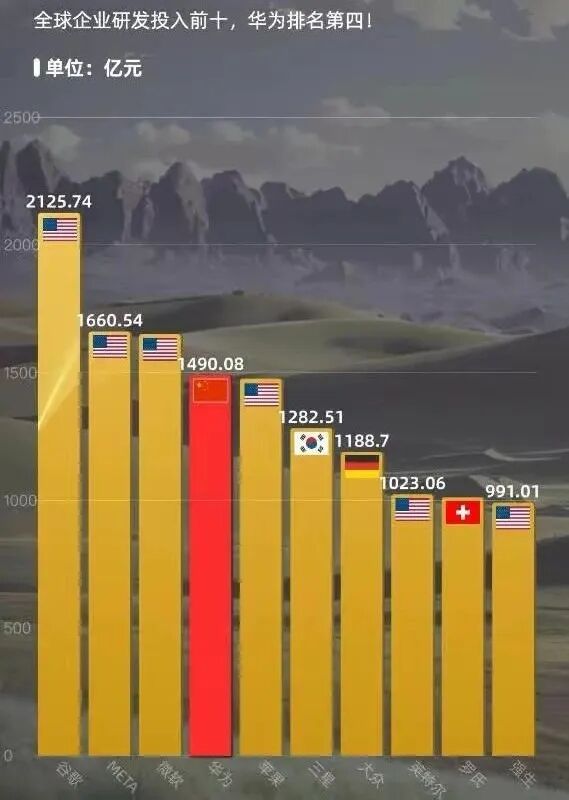根据最新全球企业研发投入排名榜单显示,中国只有1家企业入围世界前十,它就是华为,研发投入1490亿元,排名全球第四,超过苹果、三星和英特尔。