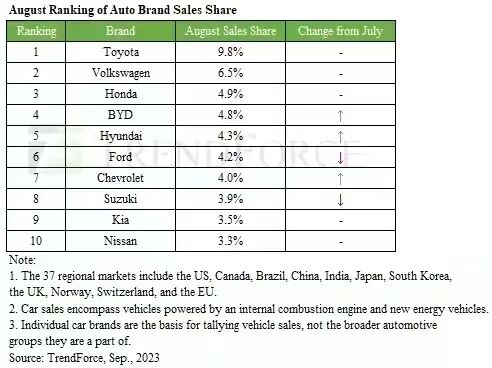 根据集邦咨询统计的全球37个市场的销量数据,今年8月的全球总销量超过550万辆,其中日本丰田以9.8%的市占率位居全球第一,德国大众第二,本田第三,比亚迪首次排名第四,超过福特、现代。