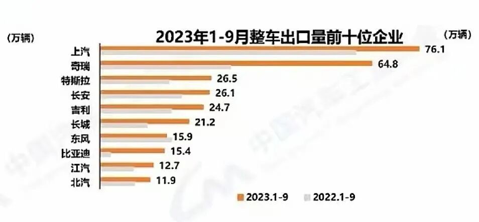 整个前三季度,汽车出口增速最高的是比亚迪,超过15万辆,同比暴涨520%,奇瑞汽车出口64万辆,大涨110%,长城汽车出口超21万辆,涨幅接近90%。