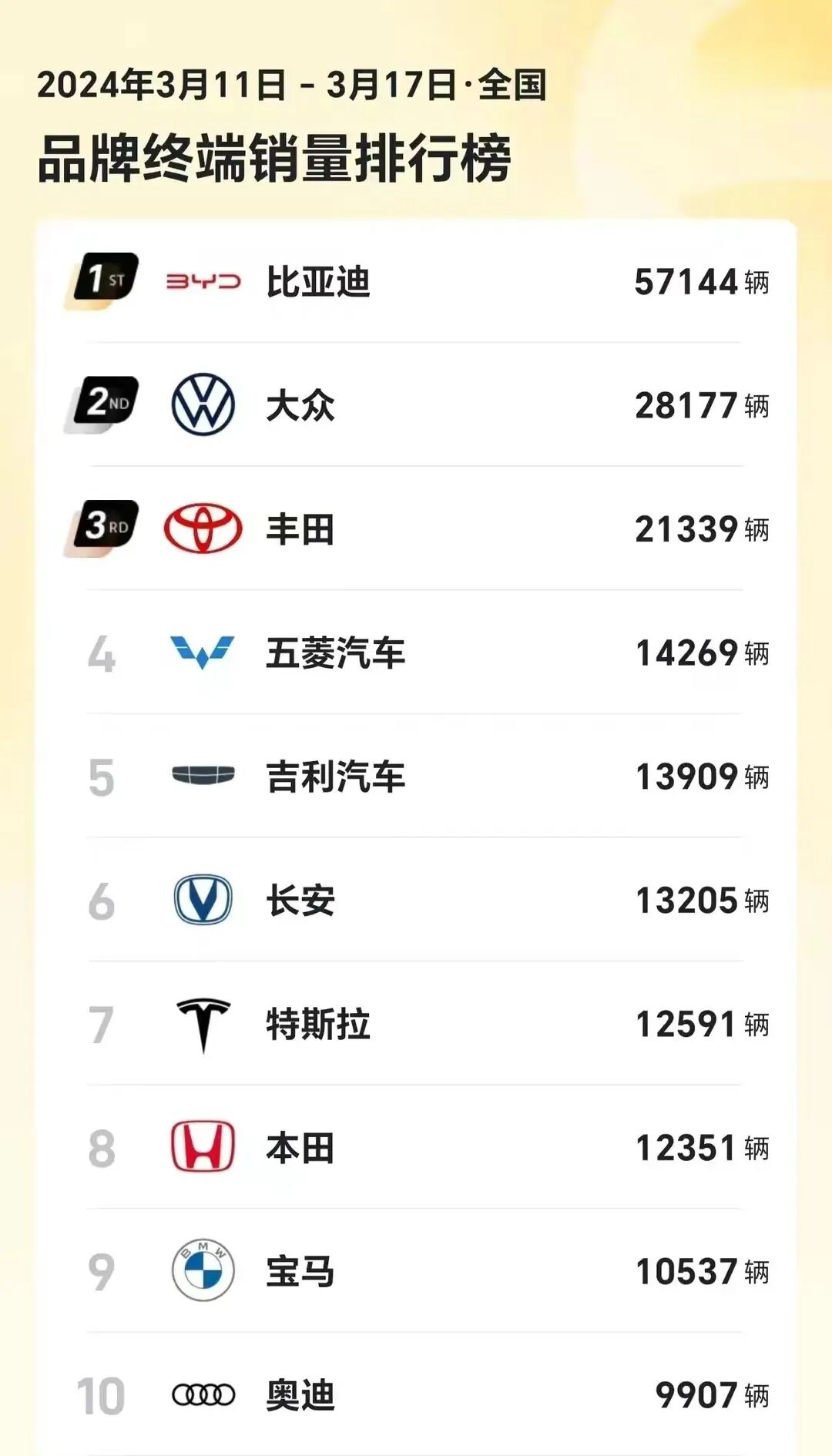 在今年3月的一周内,比亚迪创造了5.7万辆的历史纪录,碾压各大合资车企,而且超过大众、丰田的销量之和,也超过了日系车三强的销量总和,这简直很疯狂,所以笔者依然对比亚迪今年400万辆销量抱有期待。