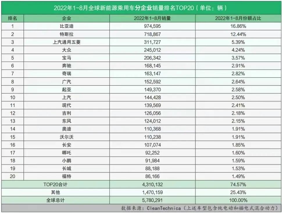 用一组数据来印证中国新能源汽车的发展势头,根据2022年8月的全球新能源汽车销量榜数据显示,比亚迪在今年前8个月实现了97万辆的销量成绩,超过特斯拉,成为世界第一,上汽通用五菱排名第三,随后是大众、宝马、奔驰等德国汽车巨头。