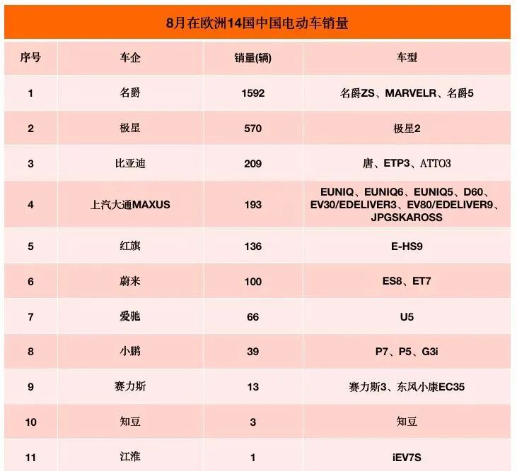 不过名爵这个品牌此前属于英国品牌,后来被上汽集团收购,对于欧洲消费者来说,名爵的品牌认同感会比较强烈,所以销量表现更好。并且八月份排名第二的极星,原本也是一个瑞典品牌,这些品牌都有欧洲血统,进入欧洲市场更容易得到消费者认可。