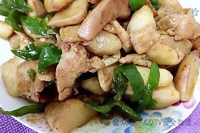 最后撒上青蒜段,继续翻炒均匀,使得香味更加浓郁,菜肴炒至香气扑鼻,野菱角软糯,肉片入味后即可起锅。