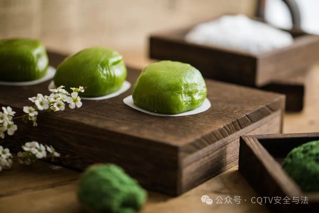 青团是用青艾汁混合糯米粉制成的绿色糕团,中间加入豆沙、黑芝麻等馅料,口感糯韧绵软、清香扑鼻。