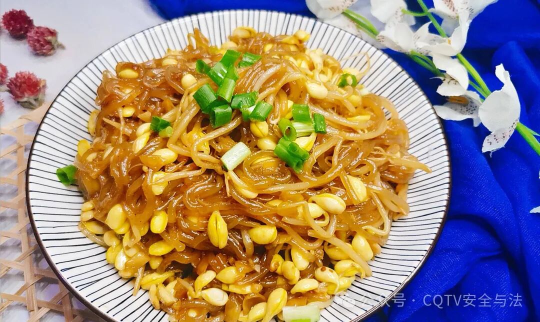 8.待粉条和黄豆芽炒熟后即可出锅,撒上一些葱花作为装饰。