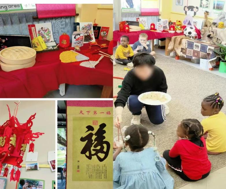 文化日那天,家长和孩子会一起准备。那天我和玉米带着锅、和好的面、调好的馅儿去给小朋友们包饺子,给他们讲解并演示怎么包饺子,让每个小朋友都试着擀一个皮,包一下饺子,一起煮了,一起吃。还挂了红灯笼,写了对联,展示了旗袍这种传统服饰等等。