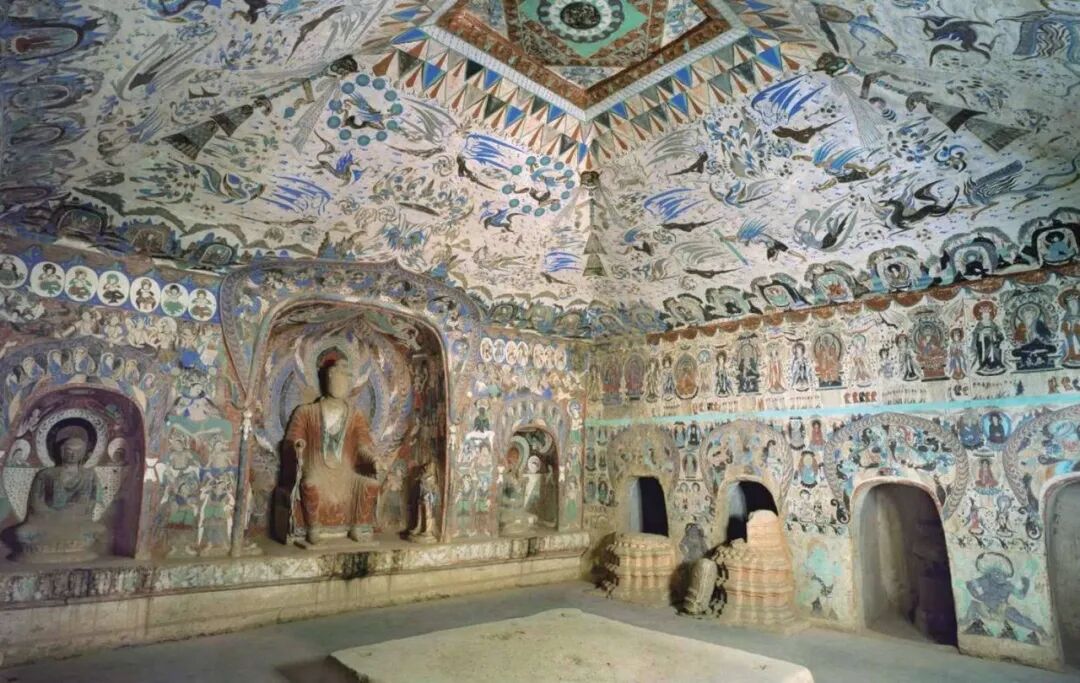 莫高窟第321窟,西壁佛龛和北壁经变采用蓝色打底,表现天宫的曼妙无穷。