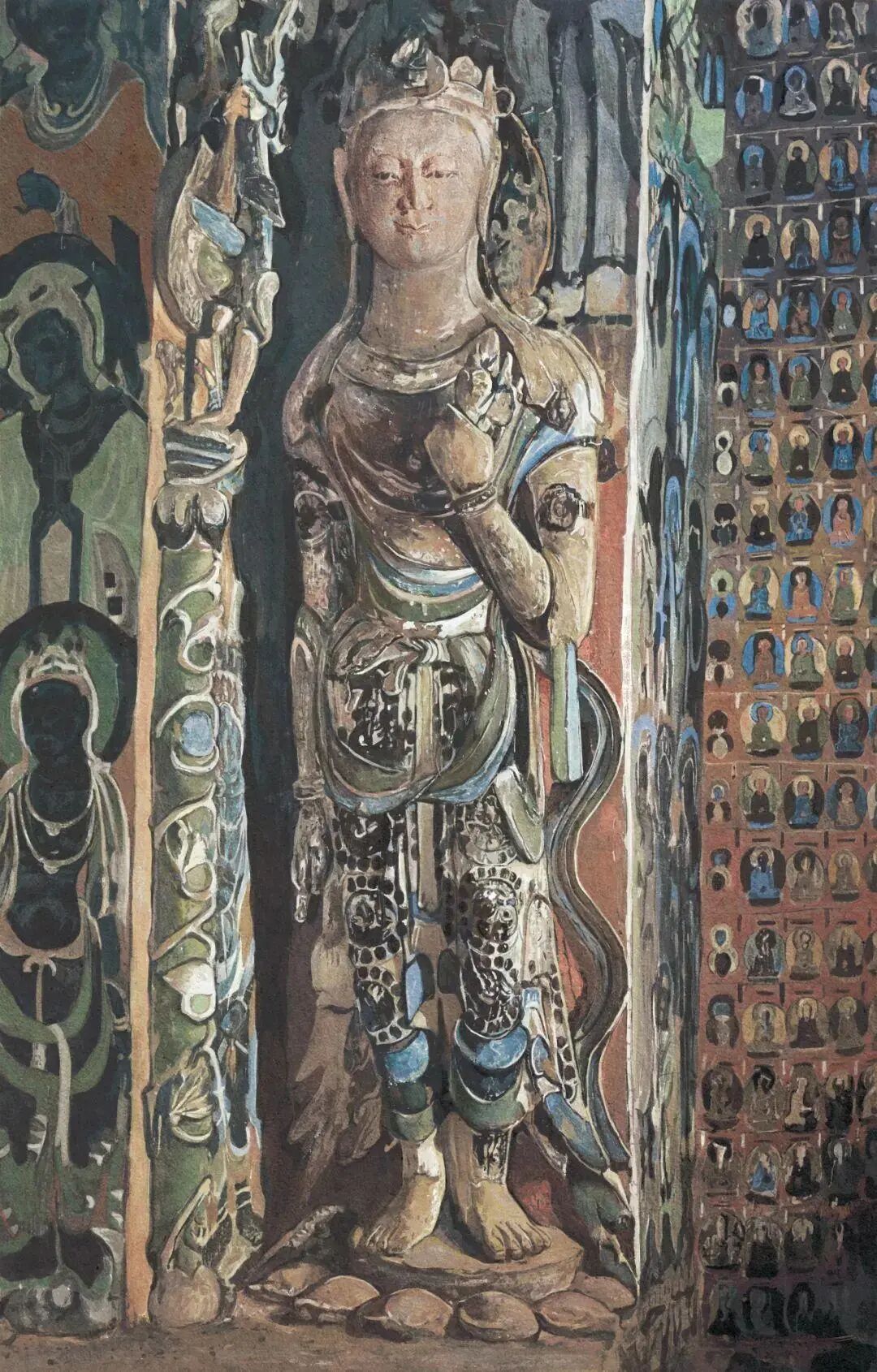 莫高窟第420窟的这尊菩萨最吸引人的地方,是她的上衣和裙装,天蓝色灼灼有光,仿佛墙壁有缝隙,透进了湛蓝的天色。