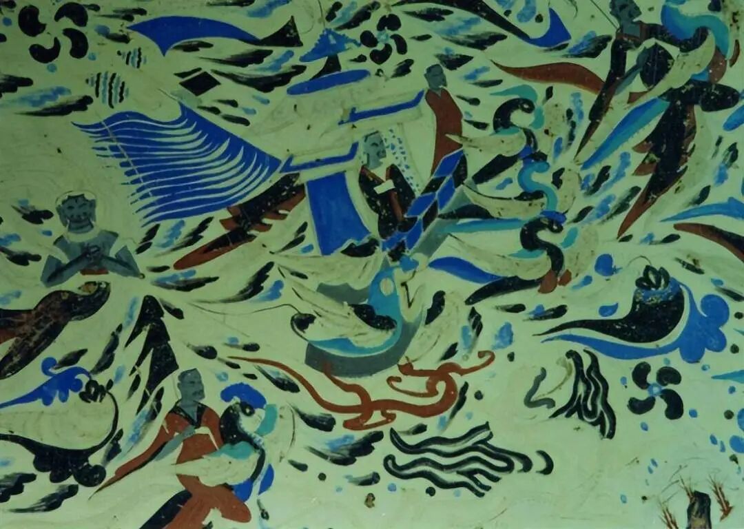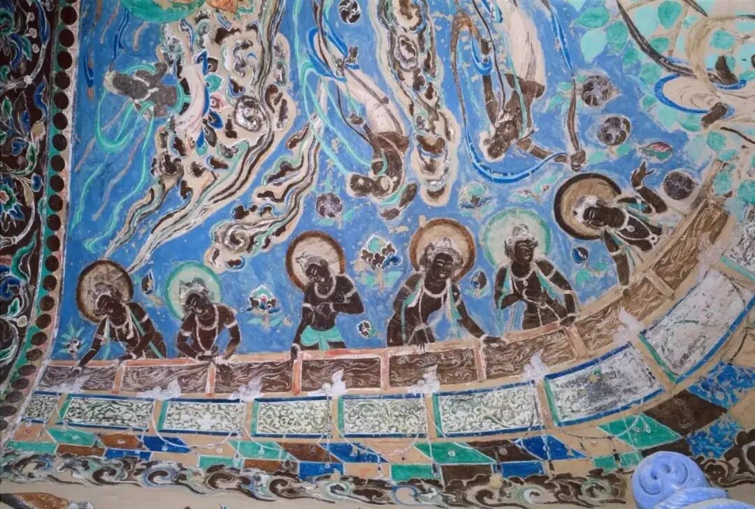 这是莫高窟第249窟窟顶北披的壁画。天蓝色是青金石,绿色是氯铜矿和石绿,红色是赭石。