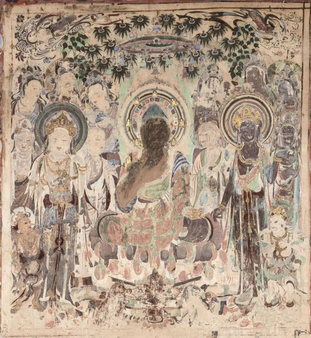 南壁的西方净土变是莫高窟出现最早、场面最大的净土变。《维摩诘经变图》中阿弥陀佛端坐在莲台,观音、大势至菩萨侍立左右,人物面貌神采呈现出唐朝丰满健美之美。