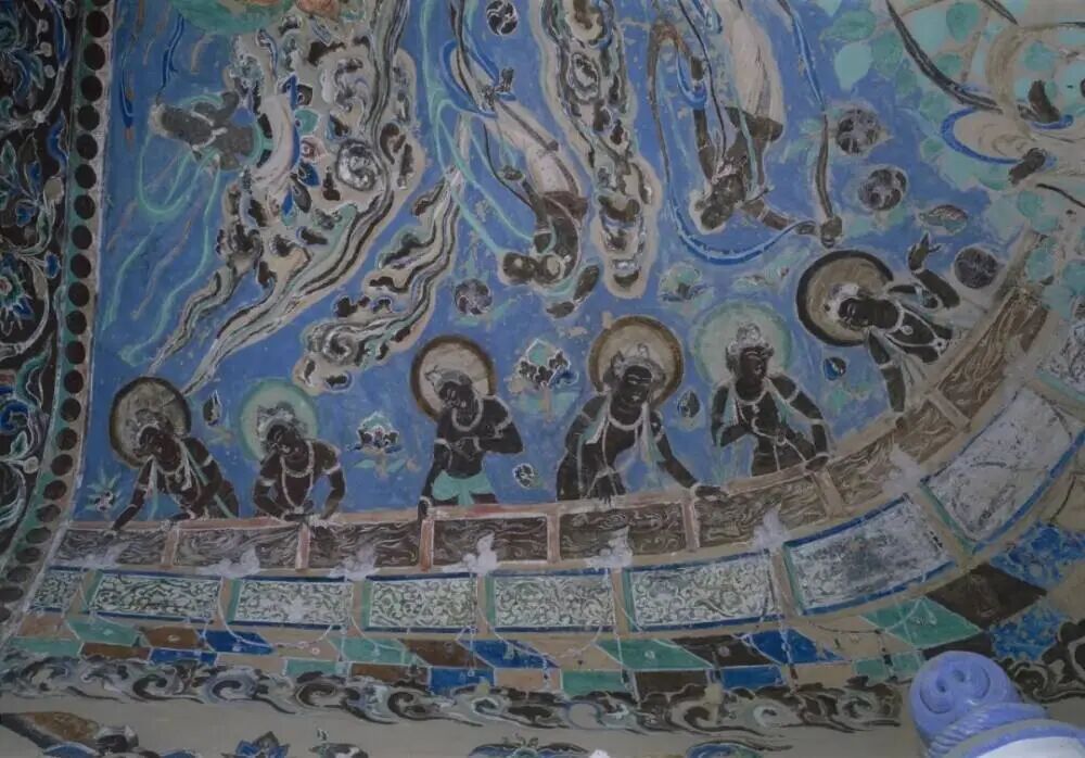 北壁的《药师经变图》,画面主体是七身药师佛,七佛上空飞天翱翔,八大菩萨侍立左右。盛大的舞乐场面中28人的乐队,演奏着多达15种乐器,两组舞伎在灯火辉煌中翩翩起舞,其中的“胡旋舞”,是双人对舞的经典之作。