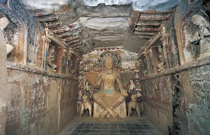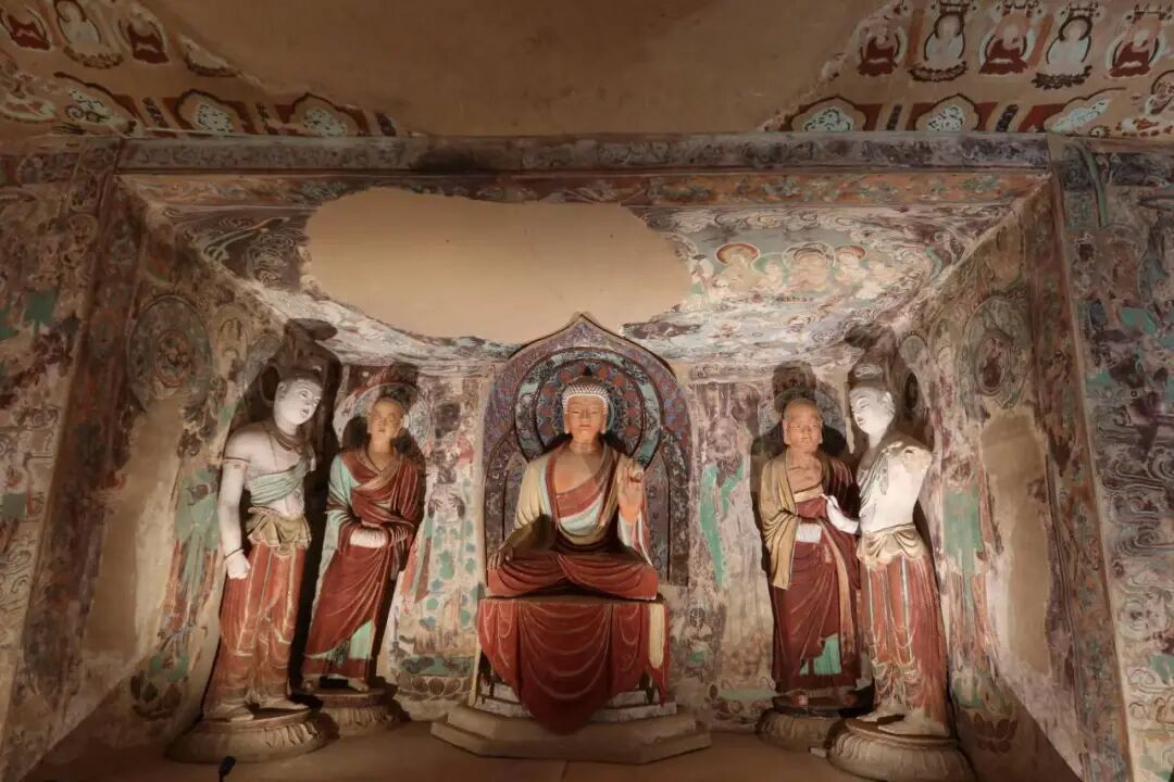 西壁的交脚弥勒菩萨是最大的交脚菩萨像,鼻梁高耸,神情端庄,稳坐在狮子座上,这座菩萨像在造型和雕塑手法上都有明显的西域痕迹。