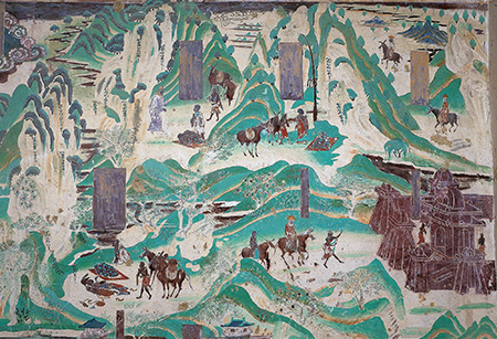 西壁龛顶的金刚经变是敦煌最早的一铺金刚经变;北壁有一幅《无量寿经变画》,几乎占据了整个壁面,画面中的建筑是初唐和盛唐建筑画的重要分水岭;南壁法华经变中的《化城喻品》把五台山画成草木葱茏的一幅游春图景,很有唐朝李思训“青绿山水”的意境。