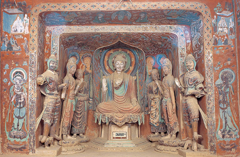 第322窟的壁画色彩浓烈,内容丰富,塑像完好,造像逼真,属于唐代的精品之作。西壁的双层龛是隋朝到初唐流行的佛龛形制,其中一铺七身塑像保持完好,中央是佛结跏趺坐,扬手说法。两侧为大弟子阿难和迦叶,外侧是两大菩萨、天王。佛的庄严,菩萨的慈祥,天王的勇武,组合在一起动中有静,刚中有柔。