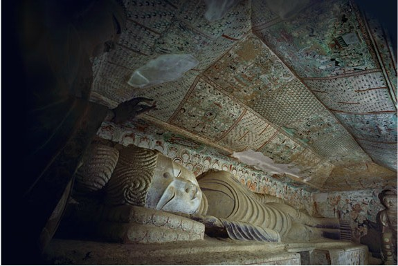 第158窟开凿于中唐吐蕃统治敦煌的时期,此窟是这一时期的代表窟,也是典型的涅槃窟。涅槃窟就是把涅槃作为洞窟的主体,前面没有遮挡而使卧佛像赫然入目。这尊涅槃像表现了释迦牟尼涅槃时的情景,双目半闭,唇含笑意,表现了“寂灭为乐”的涅槃境界,且卧佛没有经过重绘,完整保留了中唐风韵,数字敦煌也将此造像作为封面图。