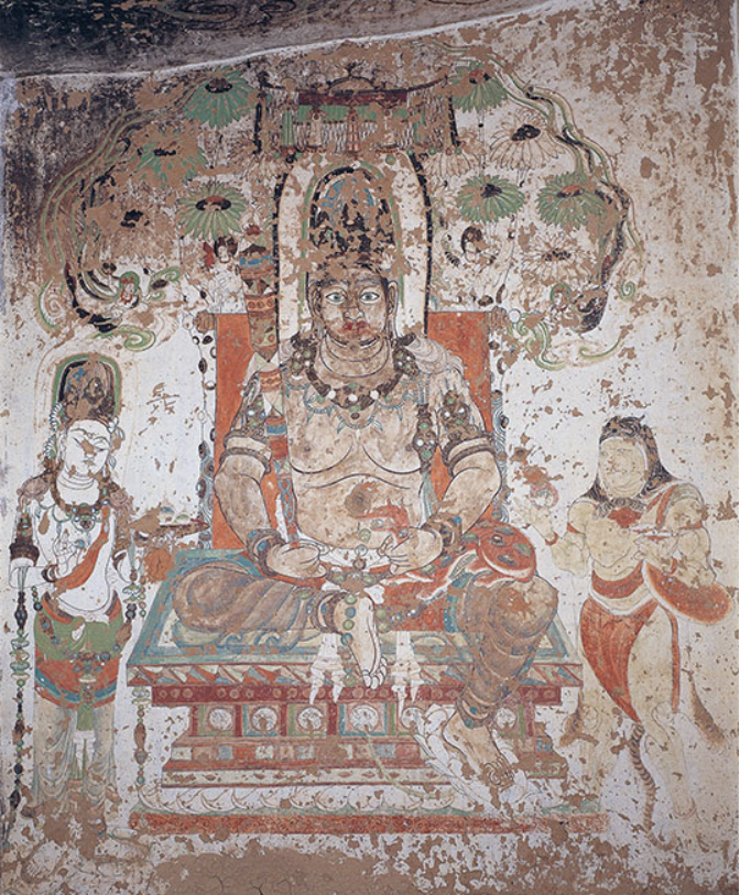 前室北壁画有一身造型独特的北方多闻天王。多闻天王居四大天王之首,是镇守北方的护法神,是古代敦煌、中亚一带最受崇拜的神灵,但此窟的多闻天王赤裸上身不着甲胄,反而如菩萨般身饰璎珞,在敦煌仅此一例。