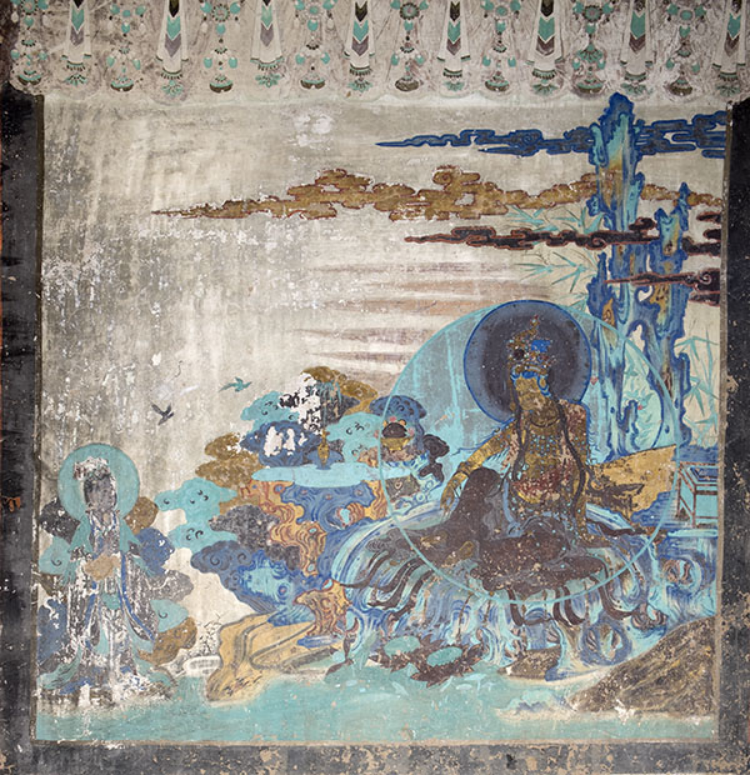 普贤变中普贤菩萨坐在六牙白象背上的莲花座,身后奇峰突起,瀑布飞泉一泻千里,寺院楼阁错落有致,竹舍茅屋清静简朴,远近山水相映成趣,南国草木馥郁繁茂。