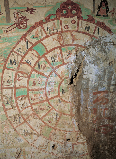 此窟前甬道南壁还画有一幅六道轮回图。佛教认为人死后会再投胎,只有不断修行,才可以摆脱轮回之苦;佛教还把世界分为六道,三个善道三个恶道。六道轮回图就是图解佛教的六道原理,用大圆轮象征在六道轮回就如车轮一样转动。这幅六道轮回图是敦煌石窟中同类题材中唯一一幅。另外在大足石窟中也有一幅相似的六道轮回图。