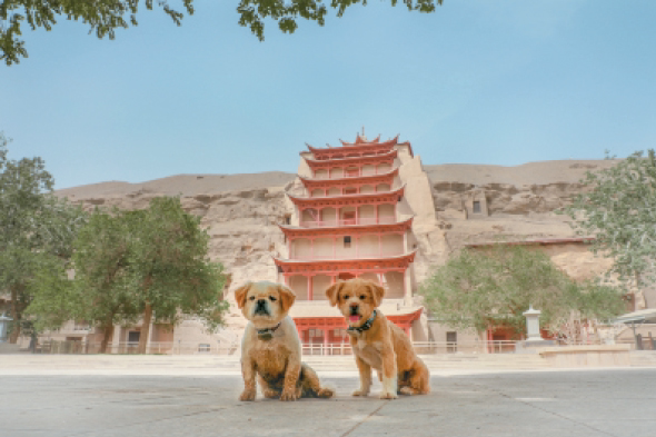 渐渐地,乐乐在游客中出名了。很多游客来莫高窟除了参观洞窟,还要特意找乐乐拍照合影,给它送衣服、送食物,即便离开莫高窟后还经常挂念它,给它寄礼物,打电话问候它。