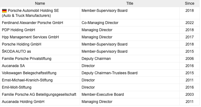 此外,他还是Familie Porsche AG Beteiligungsgesellschaft的董事会成员和Aucanada Holding GmbH董事总经理以及其他八家公司的董事会成员。