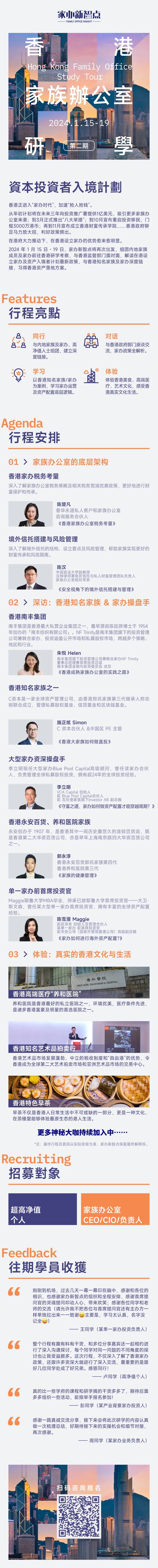 *2024年1月15日-19日,家办新智点将再次出发,组团一批内地家办及超高净值个人赴香港研学考察调研之旅,欢迎对香港家办政策,“资本投资者入境计划”及海外资产配置感兴趣的朋友扫码报名。