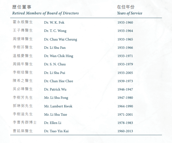 第一届董事会成员包括何高俊、尹文楷、关景良、黄菖霖、赵学、马禄臣及吴天保。其中,何高俊于1922年任首任香江养和园主席,负责养和园草创和早期发展。一年后卸任,由周怀璋医生(曾就读于香港西医书院)接替至1926年。