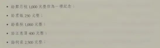 除此之外,何东还就部分人日后的生活作出具体安排。
