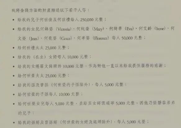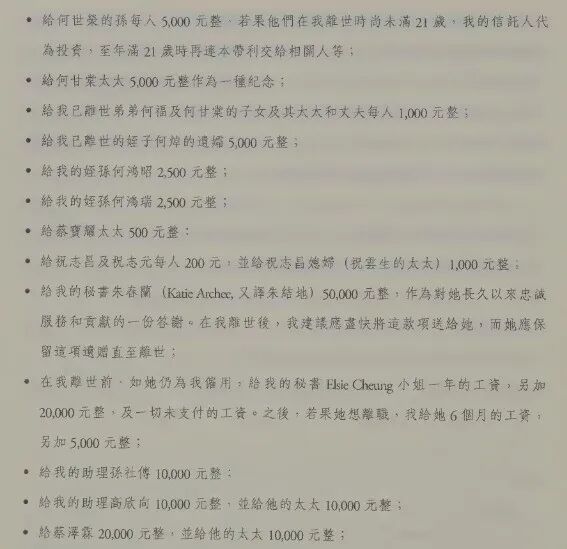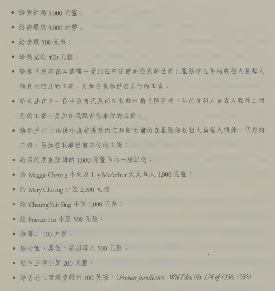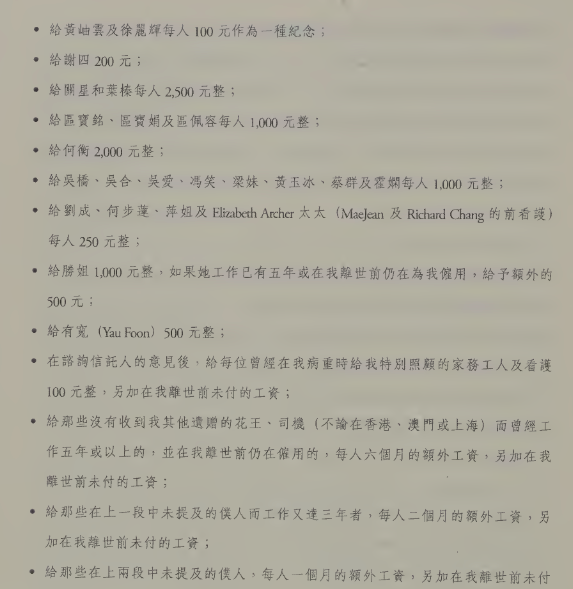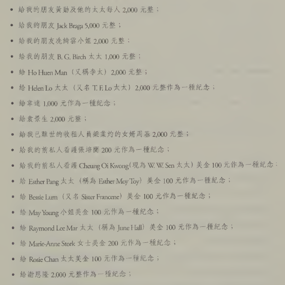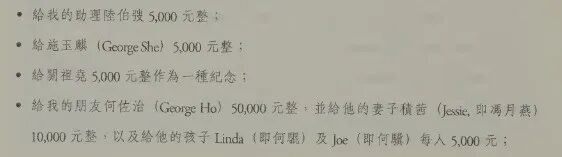 最后,何东再按家人、朋友及员工等的亲疏次序,做出资产遗赠数目和规定。