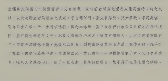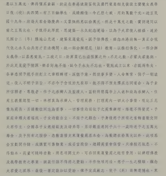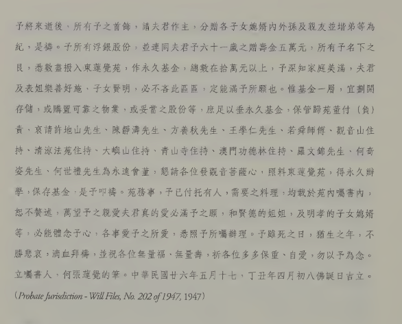 遗嘱内容分为两部分,第一部分为张静蓉创立宝觉义学及东莲觉苑的苦心,并将个人所拥有的财产悉数捐赠给东莲觉苑做永续基金使用。