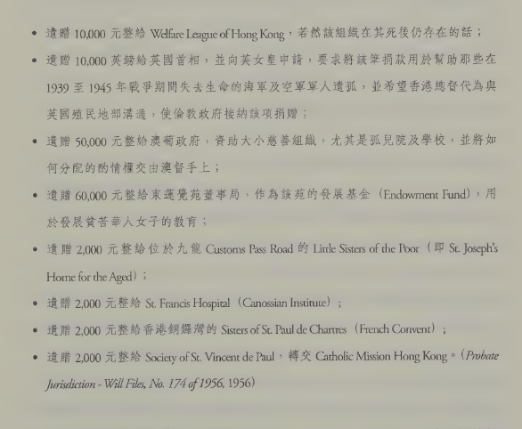 在遗赠及捐款之外,何东还在遗嘱中作了一些其他指示。
