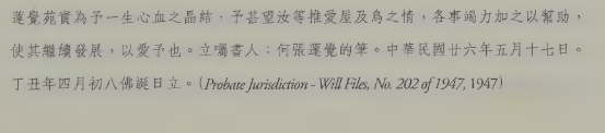 在张静蓉的遗嘱中,该遗嘱是张静蓉去世前七个月以中文手写而成,由律师公证,字数共约1300字。