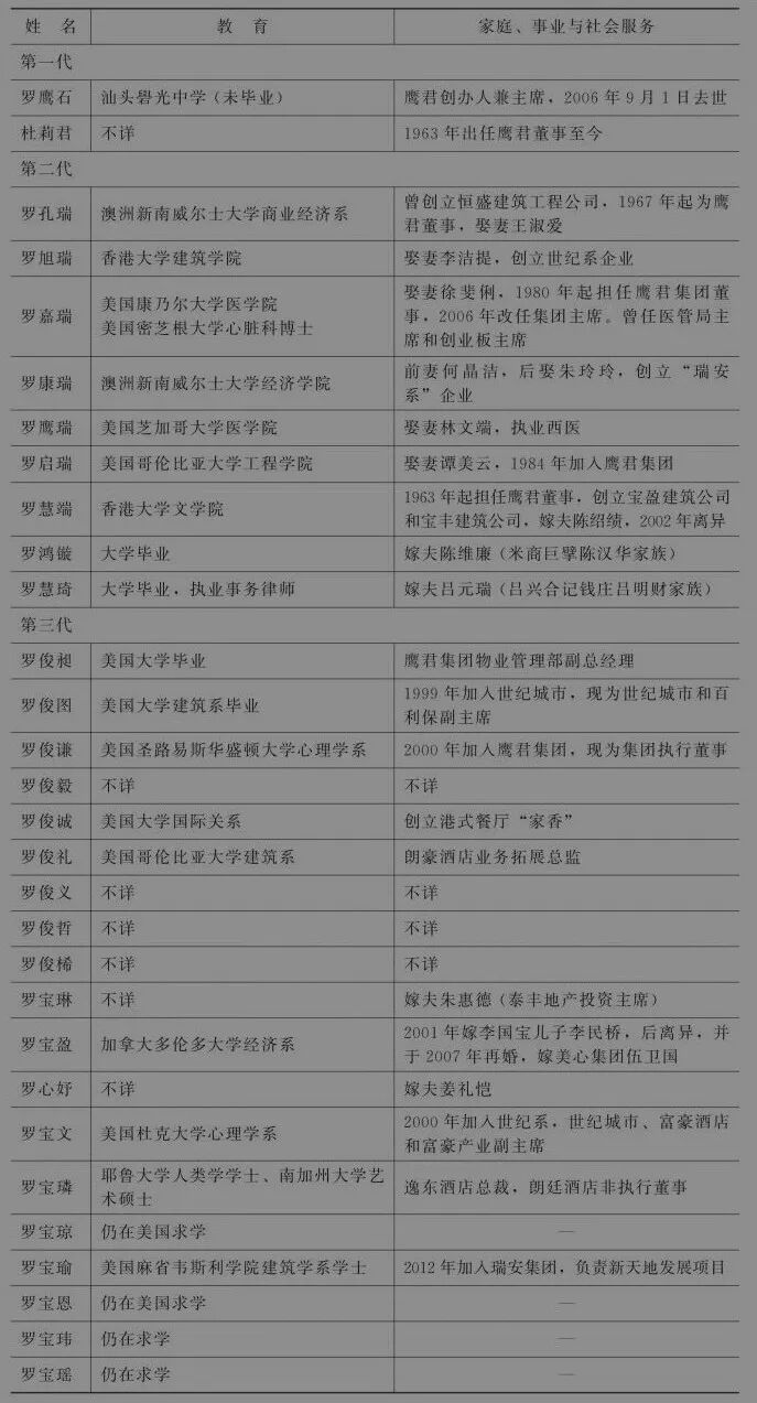 罗鹰石家族成员的教育和社会公职等资料。来源:《罗鹰石讣闻》,《香港经济日报》,2006年9月11日;“鹰君系”“世纪系”和“瑞安系”公司官方网页。