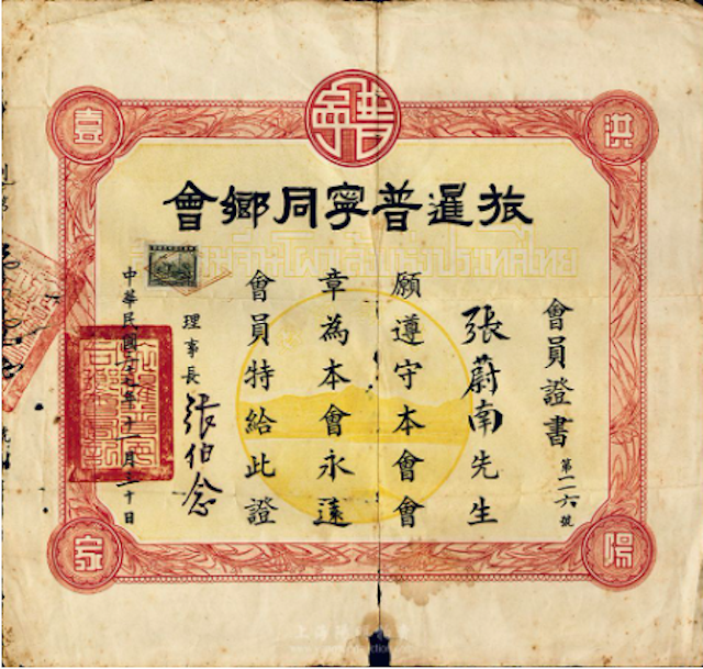 民国37年(1948年)的旅暹普宁同乡会会员证书,由理事长张伯念签署。此为泰国广东华侨社团之历史实证