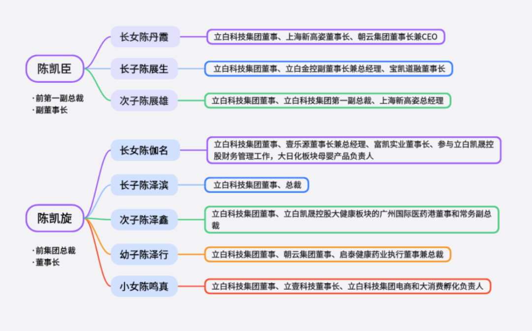 立白集团的家族传承可以说是一个典范。目前,陈凯旋的长子陈泽滨已经顺利接班,为立白科技集团董事、总裁。陈凯臣的长女陈丹霞在接手立白科技集团的超威事业部后,并且于两年后将这一部分业务独立出来,组建了「朝云集团」,并成功在港上市。