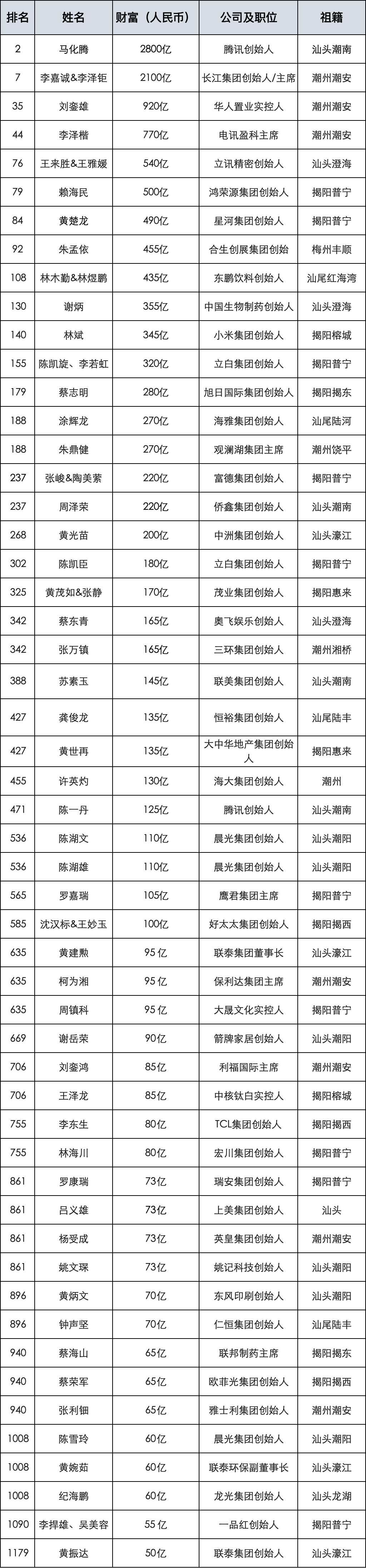 在《2023胡润百富榜》中,共有54名潮汕籍富豪上榜,总财富达15412亿。