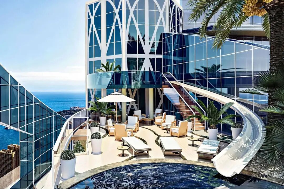 Odeon Tower顶层公寓可能没有花园,但它坐落在摩纳哥一座560英尺的摩天大楼顶部,可以欣赏到摩纳哥的壮丽景色。它拥有360度无边泳池,配有私人水滑梯,适合那些喜欢无盐游泳的人。