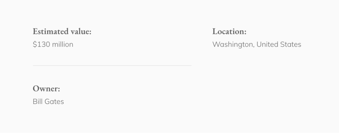 豪宅俯瞰华盛顿州麦地那的华盛顿湖,花了7年时间建成,估值1.3亿美元。庄园占地66,000平方英尺,有500棵道格拉斯冷杉树。