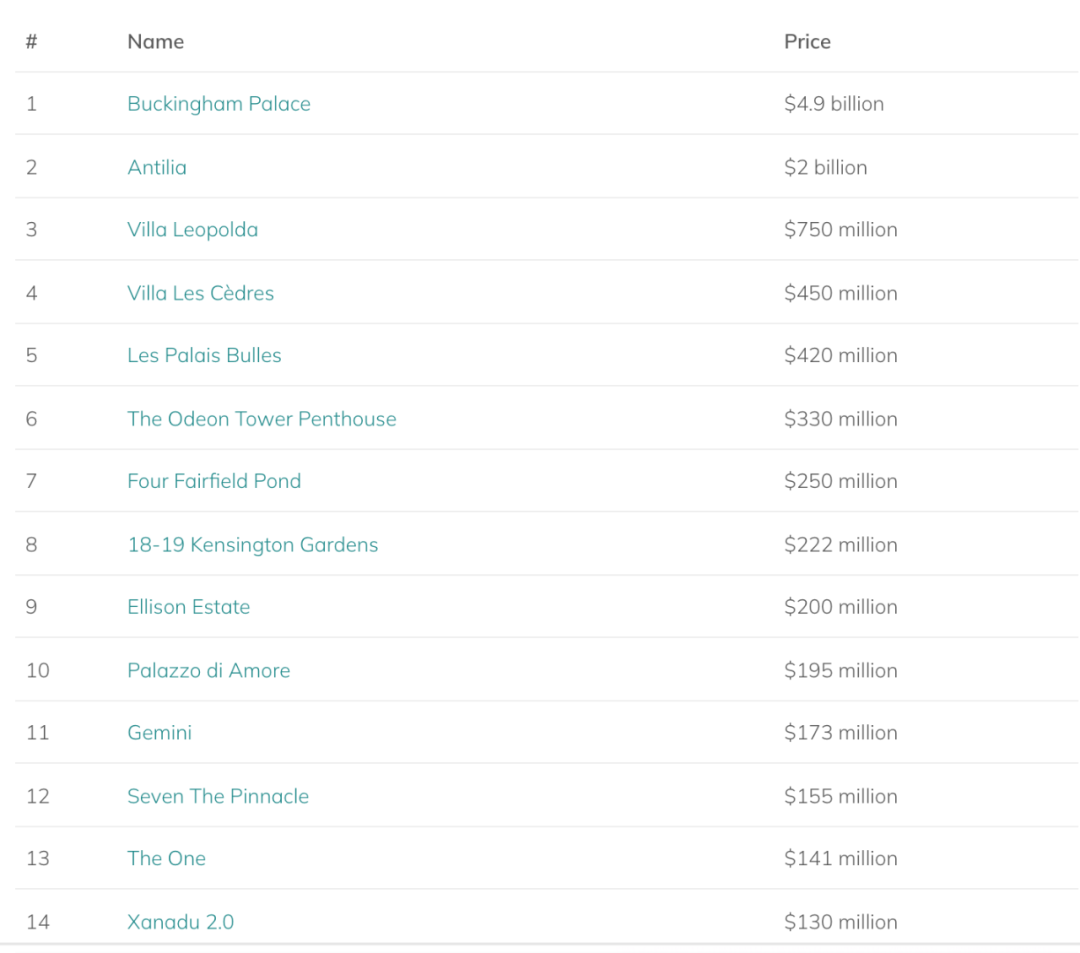 让我们看看这个标准下诞生的世界豪宅清单: