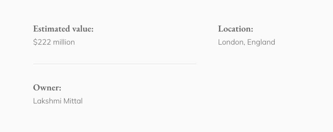 伦敦肯辛顿花园是英国最精英的街道之一,以拥有百万富翁而闻名。这座名为Nour Palace的新格鲁吉亚式豪宅在上世纪90年代以500万美元购得的,如今估值2.22亿美元,现在是印度钢铁大王拉克希米·米塔尔的家。