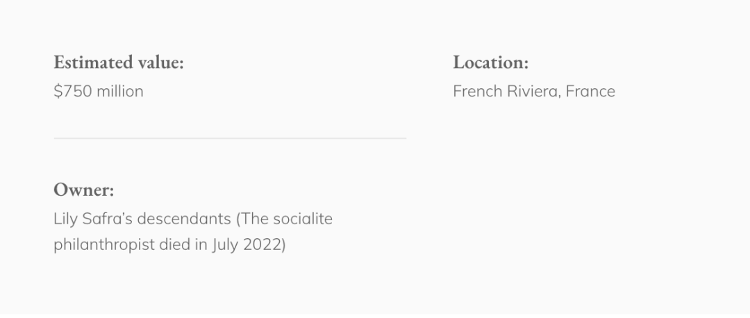 黎巴嫩裔巴西银行家Edward Safra(豪宅前任所有者)于1999年去世时,他把别墅留给了他的妻子Lily Safra,一位传奇女珠宝收藏家。2022年7月Lily去世,房子传到了她的后代手中。