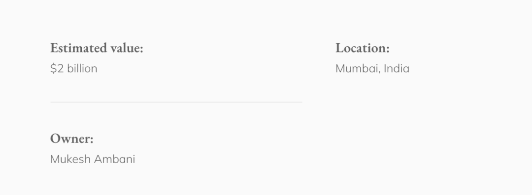 Antilia也许是世界上最昂贵的私人住宅,估值20亿美元,由印度信实集团总裁穆克什·安巴尼(Mukesh Ambani)拥有。