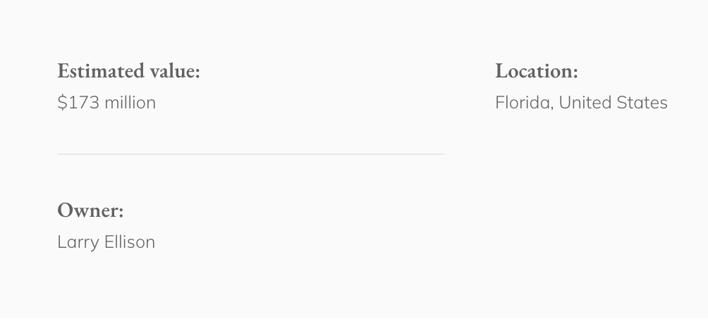 美国佛罗里达州的这幢豪宅依然和甲骨文老板拉里·埃里森(Larry Ellison)有关,他控制的一家公司从“网景”创始人吉姆·克拉克(Jim Clark)手里买下了这座的庄园。