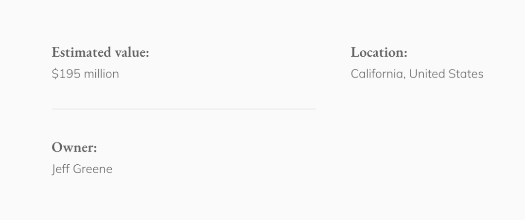 然后,它的所有者是NBA丹佛掘金队的前锋杰夫·格林(Jeff Greene)。杰夫对它进行了里里外外的翻新,花了几年的时间把房子的价值翻了一倍多,估值1.95亿美元。