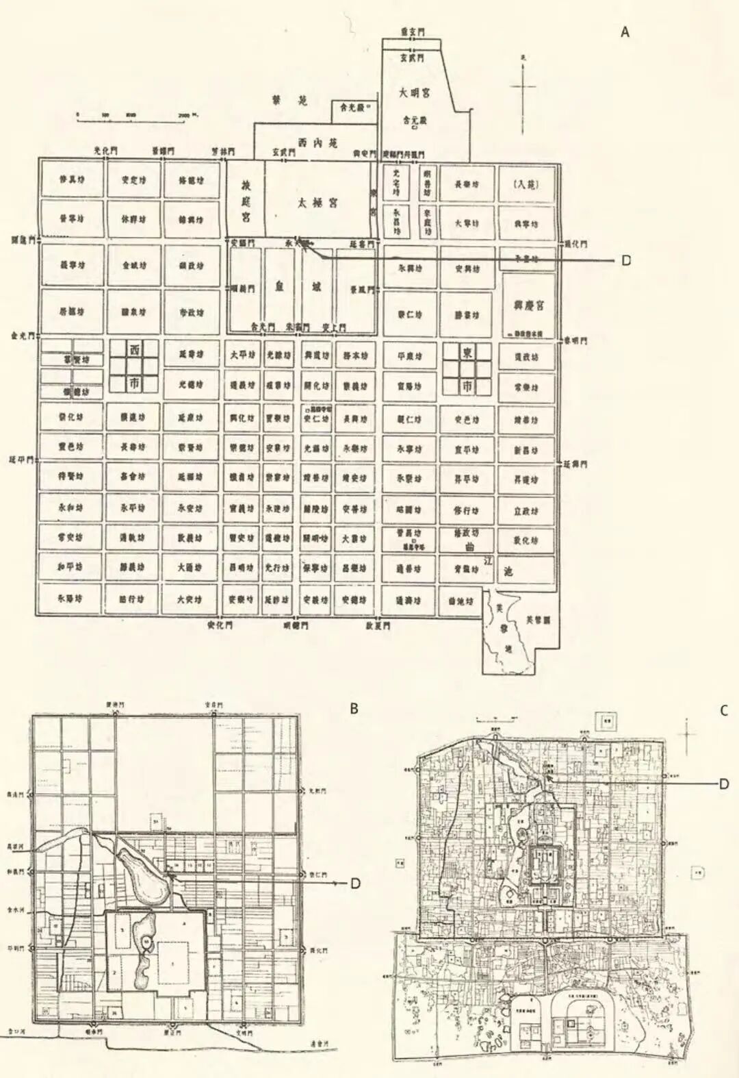 A、B、C三图分别为(唐)长安、(元)大都和(明清)北京,D标出了鼓楼所在位置。