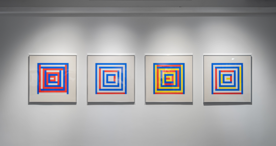 荷兰具体主义大师鲍勃·博尼斯《变化系列1-4》。而到了《变化系列1-4》的“回型”之变化在红蓝色的跳跃的协调中加入黄色和留白的空间,形成平稳的放射型的角力关系。
