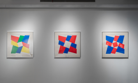荷兰具体主义大师鲍勃·博尼斯的《合围1-3》。其中的红与蓝色形成原本白色空间的挤压,仿佛被包围着的白色成了聚集后又爆棚而出的能量。一种被攒起来和相反推挤的冲突,成了“合围”的聚合与推散的图像语言。