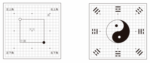 围棋点位名称,八卦图,河图,洛书。纵横交错的十九路棋盘,在东南西北四方以及天元各有9个星位,四方对应各7个星宿,成为28宿的星空图。落定为静,对弈行动;局方而静,棋圆而动。千古无同局,即成一局,棋便有阴阳、有动静、有黑白、有太极。太极生两仪,一阴一阳,两仪生八卦,三爻为基本单位,六爻八卦,问卦天下。