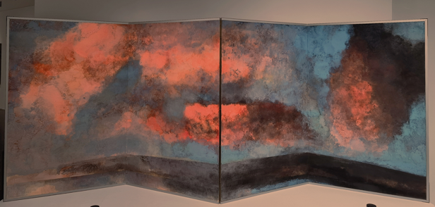 展厅中土屋禮一先生的《红云谱》。在日落黄昏,由白云转变成黑云的一霎那,被染红的云层形成这一刻的时间线,自左至右地幻化出矿物质岩彩其历久不衰的鲜艳。
