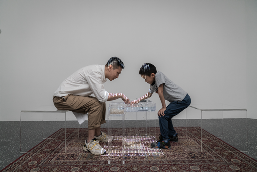 中国观念艺术家马元先生在与小外孙的游戏时,做了他最新的“观念艺术”作品《子曰》。