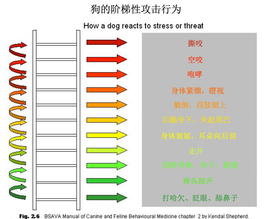 英国兽医学家、临床动物行为学家 Kendal Shepherd在一本关于犬类行为学的手册中,将狗的攻击行为按照反应强度总结成了一份清晰的图示。它们在感受到压力或威胁的情况下,攻击性会呈现阶梯式的逐级增强。| Kendal Shepherd